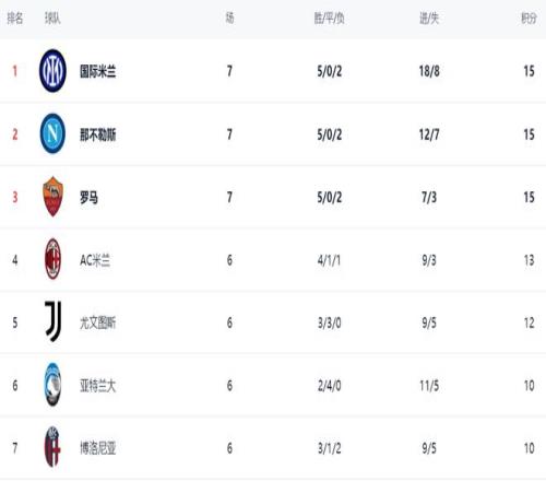 在积分榜上,前3的球队积分相同。国际米兰5胜2平拿到15分,升到了榜首位置。输球的那不勒斯也是15分,但净胜球只有5个,只能排名第2。罗马也是15分,但净胜球只有4个,排名第3。AC米兰13分排名第4。第5的是尤文图斯,3胜3平保持不败,拿到12分。亚特兰大也是不败战绩,2胜4平,拿到10分排名第6。博洛尼亚和萨索洛同样积10分,排名第7和第8。