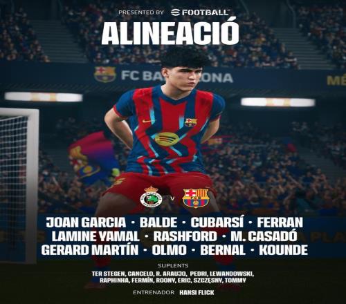 巴萨首发:13-霍安-加西亚、3-巴尔德、5-库巴西、18-赫拉德-马丁、23-孔德、22-贝尔纳尔、17-卡萨多、20-奥尔莫、10-亚马尔、14-拉什福德、7-费兰-托雷斯