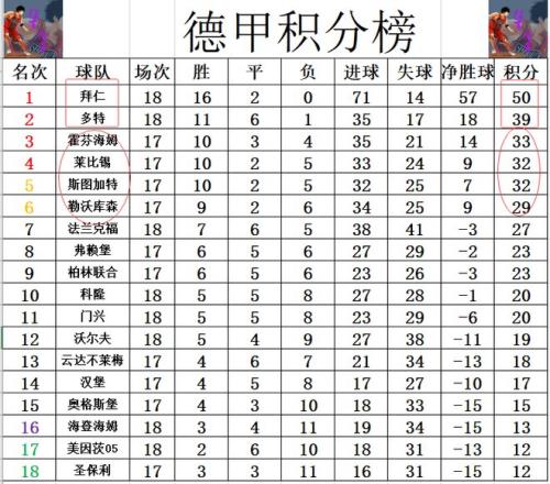 积分榜方面,拜仁和多特本轮都赢球,拜仁就还是领先多特11分稳稳领跑。莱比锡两回合被拜仁狂灌11球,今天被逆转惨败后,他们已经是落后拜仁18分之多,赶上来基本是不可能了,而且霍芬海姆再争四关键战中击败勒沃库森,1分又是超过莱比锡升至第3。